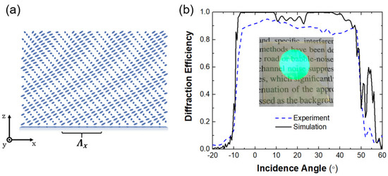 - Xiang, X.; Kim, J.; Escuti, M.J. Bragg polarization gratings for wide angular bandwidth and high efficiency at steep deflection angles. Sci. Rep. 2018, 8, 7202. [Google Scholar] [CrossRef]