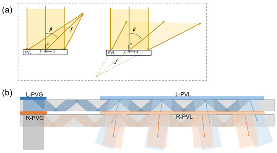 Because the diffraction efficiency of PVGs is also highly sensitive to the input polarization state, another approach based on polarization management layer (PML) can also be utilized for expanding the exit light [4,19]. As Figure 13b shows, instead of generating gradient diffraction efficiency, a PML is added on the PVG-based waveguide to boost the efficiency and distribute the output light. In such a design, the PML is essentially a transparent LC film that has different azimuthal angles at different locations to control the polarization state. Each time the light passes through the PML, the polarization state is adjusted so that the required amount of light is coupled out during the next interaction with the output coupler. By designing the film thickness and the azimuthal angle of the LC in the PML, good uniformity of the output intensity along the entire out-coupling region can be achieved. Moreover, in comparison with the gradient-efficiency method, this PML approach can provide a relatively uniform ambient light transmittance, thereby avoiding clearly visible segment regions in the EPE area.
