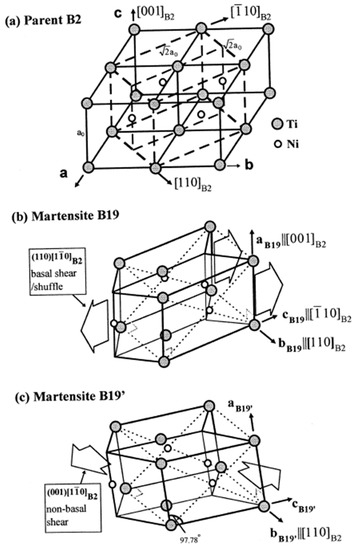 Relationship between the B2 parent crystal and one of its B19′ monoclinic daughter variants, from Otsuka and Ren [13,38]. The authors imagined the transformation in a sequential way with the help of the intermediate orthorhombic phase B19. The B19 would be formed by a stretch/shuffle along the [110], [10], and [001] B2 directions, and the B19′ would then result from an additional shear on the plane (001)B2 along [10]B2.