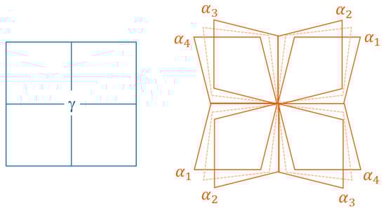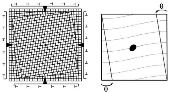 - The concept of energy used in the modern version of PTMC is strange. It is assumed that “since a rigid rotation does not change the state of a crystal, it does not change the energy” [29]. This argument allows introducing all the extra rotation Qij or Jijkl that are required to get compatibility conditions at the interfaces. It is usual in mechanics to decompose a strain matrix into a sum of a symmetric part and antisymmetric part if the strains are small, or into the product of a rotation and a symmetric matrix by polar decomposition if the strains are large. For a single crystal that is free to move instantaneously in its whole volume, one can keep only the symmetric part and ignore the antisymmetric part or the rotation because the rotation is free. However, in real materials the grains are not free to move; an accommodation between the martensite and the surrounding parent matrix is always required, even in the hypothetical case where the symmetric part is the identity and the deformation is a pure rotation. In addition, the transformation is never instantaneous because the martensite cannot go faster than the speed of sound. An accommodation between the transformed volume and the non-yet transformed volume is always needed in the transitory states, even in the hypothetical case where the austenite grain would not be blocked by the other grains and would be completely free. The elementary case of a pure “rotational transformation” is illustrated in Figure 3. In other words, the rotation part of a distortion can never be neglected. We are convinced that the gradients of the orientations observed in the pole figures of martensite in steels [43,47] result from the rotational parts of the lattice distortion that PTMC ignores by applying the “energy well” concept.