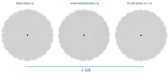 Figure 3. Rotation by 30° of 2D hexagonal crystal. The start state is at the left-hand side, with energy Us. The finish state is at the right-hand side, with energy Uf = Us. In-between is an intermediate state; the energy is Ui > Us. Even if the crystal is free to move, the rotation is not “instantaneous”, and the intermediate states are inevitable. In real materials, the boundaries are not completely free to move, and the retained rotation gradients remain in the crystal as in the intermediate state. They can be elastic or plastic depending on the amplitude of the rotation, the yield strength of the material, and the degree of freedom of the boundaries. In the intermediate state of the figure, the boundary was allowed to rotate by 15°, whereas the core was rotated by 30°. - (iii)