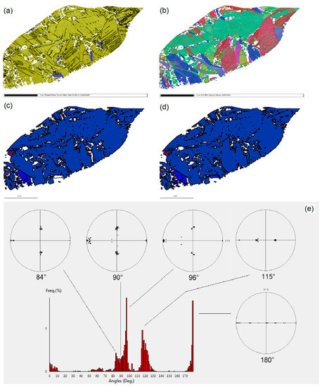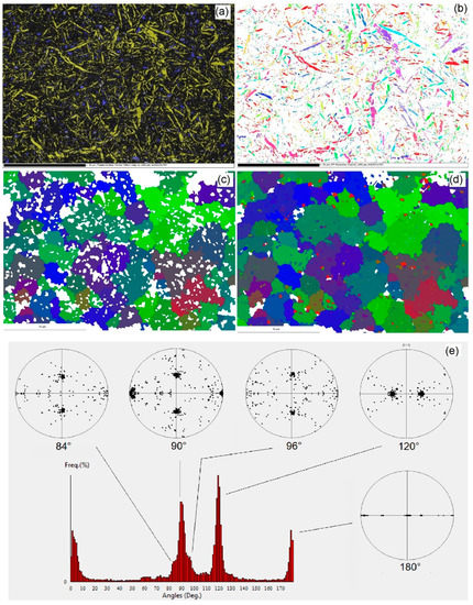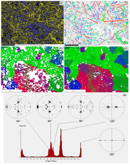 Two EBSD maps acquired at ×2k and ×3k magnifications are shown in Figure 4a,b and Figure 5a,b (the parts c, d, and e will be discussed later).