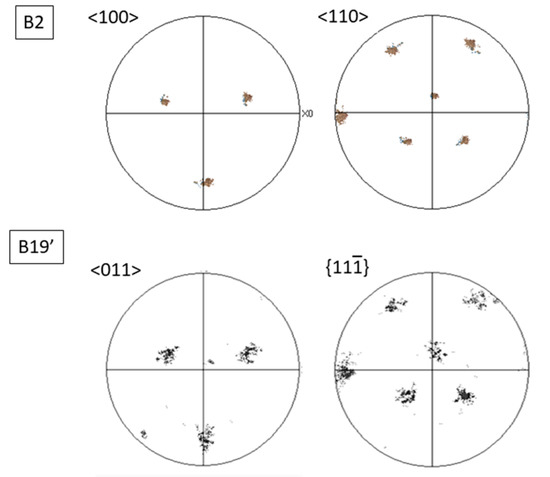 The pole figures of the B19′ martensite and reversed B2 in selected subsets of the EBSD maps allowed us to determine the ORs between the two phases. Different directions and planes were plotted in order to find by overlapping which directions or planes of B2 are parallel to those of B19′ martensite. As shown in Figure 7, some unambiguous parallelisms between planes and directions exist: {100}B19′//{100}B2, <100>B19′//<100>B2, {010}B19′//{110}B2, <110>B19′//<111>B2, <101>B19′//<111>B2, <10>B19′//<111>B2.
