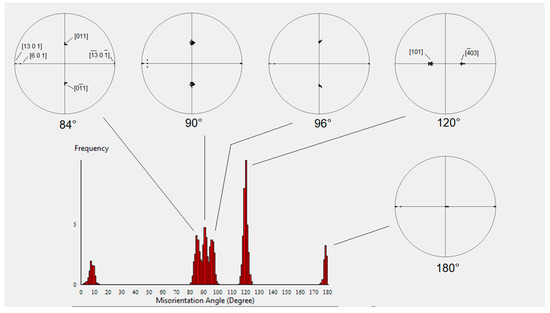 Taking into account all the variants of all the ORs and all their misorientations, we can now simulate the disorientation histogram and the stereographic projection of the rotation axes corresponding to the histogram peaks, as shown in Figure 12.
