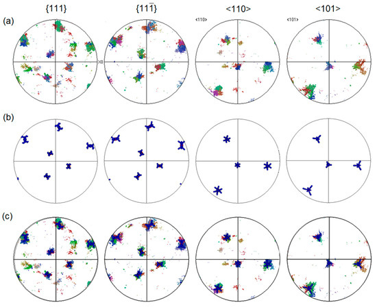 The pole figures of the {100}, {010}, and {001} planes of the B19′ martensite are shown in Figure 14. The pole figures of other planes and directions are shown in Figure 15. With only the 12 + 12 = 24 variants generated by the ORs A and C, the {100} and <100> EBSD pole figures exhibit only three groups of five spots forming the symbol five in a dice, as can be noticed in the EBSD <100> pole figure of Figure 7. Now, thanks to the TKD resolution, the {100} and <100> pole figures of the B19′ martensite clearly exhibit the continuum of rotations expected from our EBSD analysis. The A-C continuum makes that the “dice-5” feature becomes a “four-fold cross”, as shown in the left column of Figure 14a and Figure 15a. The experimental pole figures in Figure 14a and Figure 15a are well simulated with all the variants generated by the ORs A, AQ, C, CQ, I and the A-C continuum, as shown in Figure 14b and Figure 15b. The good fit can be checked by overlapping (Figure 14c and Figure 15c), even if some tiny details of the shapes of the features are not yet exactly reproduced.