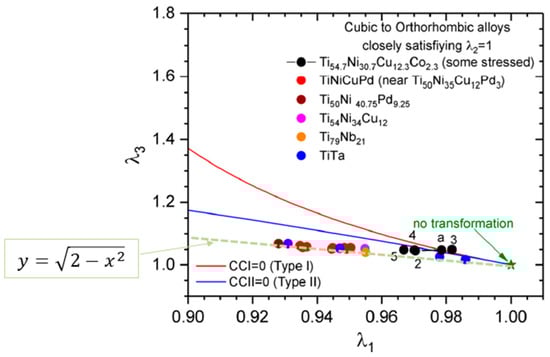 Note: We take the opportunity of this paper to propose a possible explanation for the strange observation made by Gu et al. [31]. They observed that for many cubic-orthorhombic transformations in Ti-based shape memory alloys, when the eigenvalues and of the stretch matrix are plotted on a graph reproduced in Figure 16, they “fall closely on a straight line in this plot, a fact which is not understood”. We think it possible that these two values are actually linked by the existence of an invariant dense direction, which would be the diagonal of the rectangle formed by the eigenvectors associated with and . It would mean that, for all these transformations, the values are linked by the relation . As and are close to 1, the curve representing the relation between and is nearly a line. We reported it in a green dash on Figure 16, and it fits well with the experimental points.