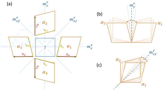 A simple 2D example of a square (γ)–parallelogram (α) transformation. (a) There are four distortion variants assuming for the “natural” OR. (b) Closing-gap OR and associated rotation gradients between the variants and . This new OR “cures” the broken symmetry . (c) Closing-gap OR and associated rotation gradients between the variants and . This new OR “cures” the broken symmetry .