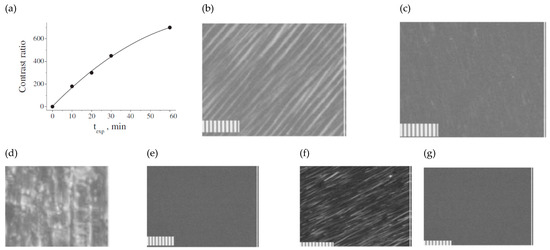 Sufficiently large exposure time texp (exposure energy) and decrease of dislocation density improve the contrast ratio (Figure 2a). This is confirmed by FLC textures images, which are depicted in Figure 2b,c. Bright stripes in Figure 2b show the dislocation lines in the dark state. The dislocations vanish when the exposure time is sufficiently long (see Figure 2c).