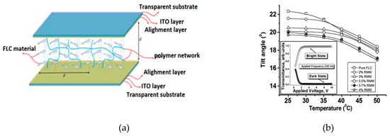 To fabricate the cell, we used ITO-coated substrates as the electrodes, which were coated with the azo dye SD-1. Then, the substrates were irradiated by UV light to enable us to achieve planar alignment. The thickness of the cells was maintained at 1.5 μm. The mixture at the temperature slightly lower than the N-I transition temperature was filled into the cells by capillary action. If, after the polymerization process, the composites show optical parameters (at 30 °C) that satisfy the ESHFLC constraints, then the cell can be considered successful. The polymerization at lower temperatures immediately after the cell filling is important to avoid the near surface localization of the polymer network. An illustration of the ESHFLC cell is shown in Figure 4a.