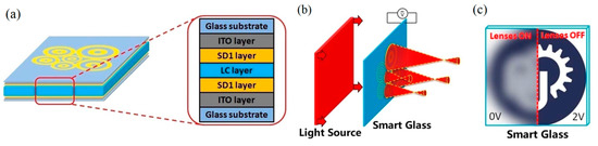 When the alternating current (AC) signal (2V) was applied to the smart glass, a clear (voltage ON) state with the transmittance >90% was immediately obtained (see school logo and several Chinese characters in Figure 8b) from the printed paper. In the absence of the external voltage, the natural light diffusively reflects from the printed paper. Consequently, the image is distorted, giving rise to the blurred image, which is shown in Figure 8c. Note that a part of the smart glass without LC Fresnel lens remains transparent. Indeed, the low driving voltage as a significant merit of the fabricated prototype, making our proposed LC smart glass highly appropriate for versatile applications in portable and wearable technologies.