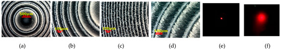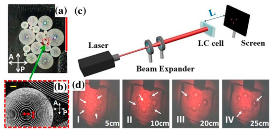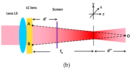 In order to determine focal lengths of the Fresnel lenses, a He–Ne laser (λ = 632.8 nm) was used. The spot size was focused to a diameter of 3 cm. The diffraction patterns can be seen on the screen, which is placed behind the cell. The distance between the LC cell and the screen is L. The corresponding setup is depicted in Figure 7c.