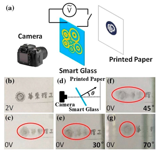 Experimental studies for oblique observation through the LC smart glass were carried out by horizontal rotation of the device by angle θ (Figure 8d). The captured distorted images for different angles (i.e., 30°, 45°, and 70°) are depicted in Figure 8e–g, respectively. The proposed LC smart glass shows outstanding performance under normal and oblique observations. By elaborating the design of LC lenses with small focal lengths, e.g., less than 1 cm, the smart glass performance can be noticeably enhanced for privacy protection.