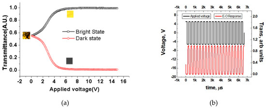 (a) Transmittance vs. voltage for bright and dark states of the ESHFLC mode. (b) Electro-optic performance of ESHFLC mode in comparison with the applied voltage (3 kHz, 5 V).