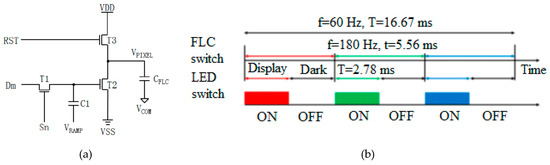 (a) The proposed pixel circuit structure for an active matrix ESHFLC to generate gray levels. (b) Driving scheme for an active matrix of FSC ESHFLC.
