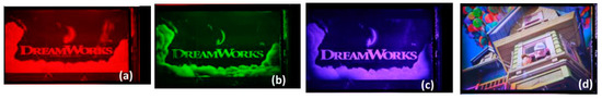 Prototype of the field-sequential color video display, based on the ESHFLC mode. R, G, B, respectively, sub-frame images: (a), (b), (c). Full-color image (d).