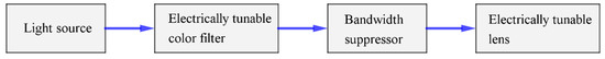 In order to control the fluence (in the unit of J/cm2) and select the wavelength of light, a tunable optical system for photobiomodulation should contain four elements: a light source, electrically tunable color filter, bandwidth suppressor, and electrically tunable lens, as shown in Figure 17.