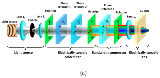 The effective slow axis of the optical phase retarders can be switched along θ = 135° at +10 V or θ = 90° at −10 V (i.e., θ1 and θ2 in Figure 18 are 135° or 90° depending on the applied voltage) due to the bistability of FLC. The bandwidth suppressor consists of another LC phase retarder (phase retarder 3) and a polarizer. The electrically tunable lens is denoted by L3 with the lens power of 12 D.