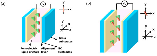 Surface-stabilized ferroelectric liquid crystals (SSFLC) and electrically suppressed helix ferroelectric liquid crystals (ESHFLC) can be used to realize switchable two-domain structures, e.g., gratings or Fresnel lens. However, the optical phase shift always exists when we deal with the PBL because the optical axis just sweeps in the plane of the cell substrates. In this section, we review the DHFLC mode for the PBL. A schematic representation of the DHFLC cell is shown in Figure 9a.