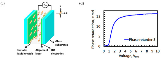 Figure 9b,c shows a schematic representation of the experimental setup. A thin quarter-wave plate (QWP)/half-wave plate (HWP) LC polymer thin-film PBL was designed when the diffraction efficiency has the maximum value for the wavelength of 450 nm. This can be achieved when the quarter-wave or half-wave conditions are satisfied.