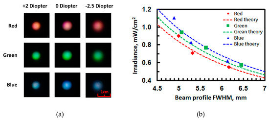 (a) Beam spots at different lens powers for different transmissive color modes. (b) Irradiance as a function of beam diameter at different modes.