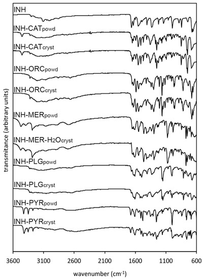 Infrared spectra of the solid powders of INH, ORC, MER, CAT, PLG, and PYR, the polycrystalline ground powders, and the single crystals were obtained in a Bruker Tensor 27 spectrophotometer (Bruker, Ettlingen, Germany) equipped with an attenuated total reflection (ATR) system accessory (16 scans, spectral range 600–4000 cm−1, resolution 4 cm−1).
