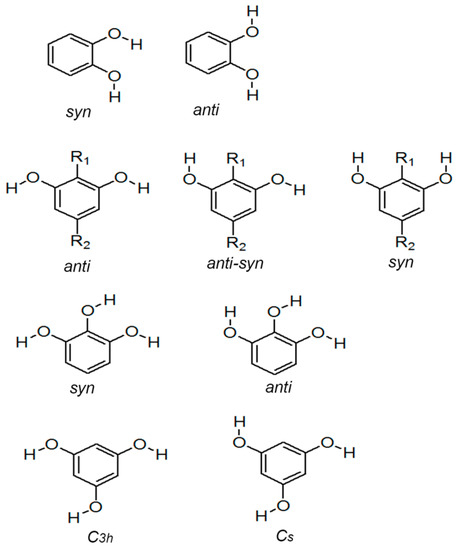 The geometric parameters associated with intermolecular non-covalent interactions D–H⋯A are summarized in Table 2. Classic hydrogen bonding interactions and π-stacking are in agreement with accepted criteria [27,28]. Hydrogen bond patterns are described according to graph set notation [29]. Possible conformations of polyphenols [30,31,32,33] and supramolecular synthons are shown in Figure 4 and Figure 5, respectively.
