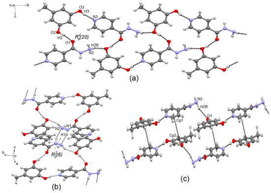 INH-CAT cocrystal. The isoniazid-catechol cocrystal crystallizes in the monoclinic P2/c space group, with one molecule of INH and one and a half different molecules of CAT in the asymmetric unit. A dimeric unit of CAT (synthon IX) in the syn conformation is formed via O4–H4···O3 R22(10) hydrogen bonds (CAT also form the O4–H4···O3 S(5) intramolecular hydrogen bond). INH molecules are linked to the catechol dimer by the N2–H2B···O4 (synthon III) and O3–H3···O1 (synthon II) hydrogen bonds to form an INH2–CAT2 centrosymmetric tetramer depicting a set of R33(9), R22(10), S(5) hydrogen bond motifs, similar to those observed in the isoniazid-caffeic acid cocrystal [8]. The first dimensional array is given by the interlinking of tetramers by the N1–H1···N2 (synthon VIII) hydrogen bonds forming a supramolecular tape running along the c axis (Figure 8a). Tapes are connected by the second crystallographic independent molecule of CAT, which forms two O2–H2···N3 (synthon I) hydrogen bonds extending a bidimensional supramolecular sheet along the ac plane (Figure 8b). The angle between the pyridine ring and the hydroxyl group plane is 19.56° (C4–N3–H2–O2 torsion angle). The interlinking of sheets by the N2–H2A···O1 (synthon VI), N2–H2B···O4 (synthon III) hydrogen bonds, and π-stacking (Cg1···Cg3 = 3.737(10) Å; Cg1···Cg3 = 3.750(10) Å; Cg1 = N3/C4/C3/C2/C6/C5; Cg3 = C7/C8/C9/C10/C11/C12) give the third dimensional supramolecular array (Figure 8c).