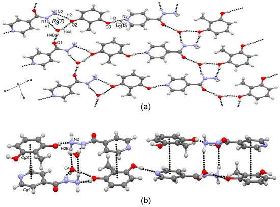 The INH-MER–H2O cocrystal hydrate crystallizes in the monoclinic P21/c space group with one molecule of INH, one molecule of MER adopting the anti conformation, and one molecule of water in the asymmetric unit. A supramolecular infinite C24(21) chain, similar to the INH-RES cocrystal [8], is formed when one hydroxyl group of MER is linked to an INH molecule by the O3–H3···N3 (synthon I) hydrogen bond and another hydroxyl group of MER forms the O2–H2···N2 (synthon V) hydrogen bond. Here the anti conformation favors the formation of an infinite chain. The angle between the pyridine ring and the hydroxyl group plane is 166.77° (C4–N3–H3A–O3 torsion angle). Water molecules link the INH-MER chains by O4–H4A···O2, O4–H4B···O1, and N1–H1···O4 hydrogen bonds to give a two-dimensional supramolecular sheet extended along the (1 0 2) plane (Figure 7a). The whole supramolecular assembly is given by pairing sheets linked by the N2–H2B···O4 hydrogen bond and π-stacking (Cg1···Cg2 = 3.512(9) Å, Cg1 = N3/C4/C3/C2/C6/C5; Cg2 = C7/C8/C9/C10/C11/C12) (Figure 7b).
