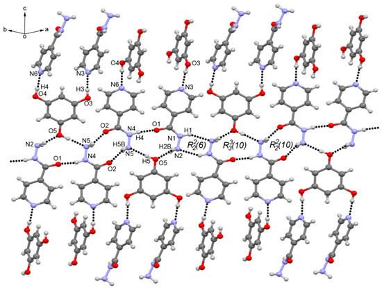 INH-PLG cocrystal. The crystal structure of the mechanochemically obtained INH-PLG cocrystal is similar to the one reported in [37]. The isoniazid-phloroglucinol cocrystal crystallizes in the monoclinic P21/c space group with two different molecules of INH and one molecule of PLG (in the C3h conformation) in the asymmetric unit. Two of the hydroxyl groups form O–H···N (synthon I) hydrogen bonds (O4–H4···N6 and O3–H3···N3), and the other forms the O5–H5···N5 (synthon V) hydrogen bond. The angles between the pyridine ring and the hydroxyl group plane are 126.23° and −133.80° (C4–N3–H3A–O3 and C11–N6–H4B–O4 torsion angles). A central supramolecular tape is formed by a set of N-H···O (synthon VII) (N4-H4···O1; N5-H5B···O2), N–H···N (synthon VIII) (N1–H1···N2), O–H···N (O5–H5···N5) (synthon V), and N–H···O (synthon III) (N2–H2B···O5) hydrogen bonds showing adjacent R22(6), R33(10), R22(10) motifs extended along the (2 4 −5) plane (Figure 9). A supramolecular sheet is formed when INH and PLG molecules are linked to the central tape by the O4–H4···N6, O3-H3···N3 (synthon I) hydrogen bonds in an almost perpendicular way with C4–N3–H3A–O3 = 126.23° and C11–N6–H4B–O4 = 133.80° torsion angles, similar to that observed in the phloroglucinol-isonicotinamide hydrate cocrystal and the resorcinol-4-pyridine-carboxaldehyde cocrystal [38,39]. The interconnection of supramolecular sheets is given by the N2-H2A···O2 (synthon III), O3–H3···N3, and O4–H4···N6 (synthon I) hydrogen bonds, generating the 3D supramolecular array.