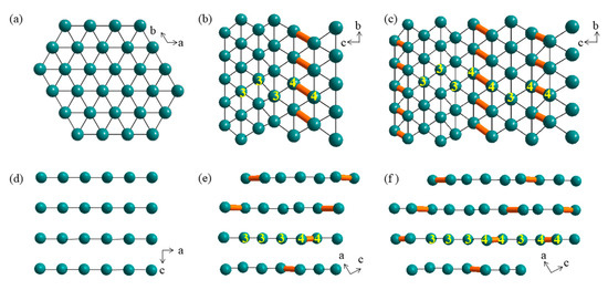 Crystal structure of IrTe2 in (a,d) high temperature (HT) phase, (b,e) 1/5 phase and (c,f) 1/8 phase. Only Ir atoms are shown in the structures. (a–c) are views perpendicular to the ab plane; (d–f) are side views. Ir4+-Ir4+ dimers are connected with yellow lines, other Ir-Ir bonding is shown in black lines.