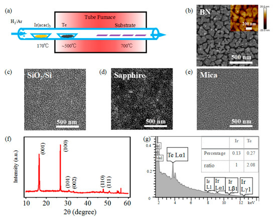 (a) Illustration of tube furnace for the growth of IrTe2 films; (b–e) SEM images of as-grown IrTe2 films on h-BN, SiO2/Si, sapphire and mica substrates, (f) XRD and (g) EDS spectra of as-grown IrTe2 films on h-BN adopting Ir(acac)3 precursor.