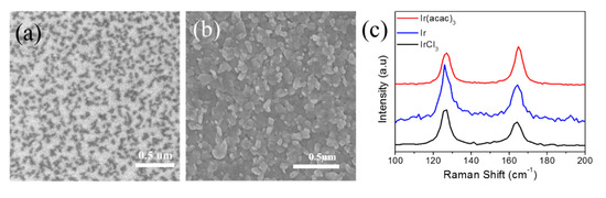 (a,b) SEM images of as-grown IrTe2 films using (a) IrCI3 and (b) Ir precursors, (c) Raman Spectra of as-grown IrTe2 using Ir(acac)3 (red line), IrCI3 (black line) and Ir (blue line) precursors.