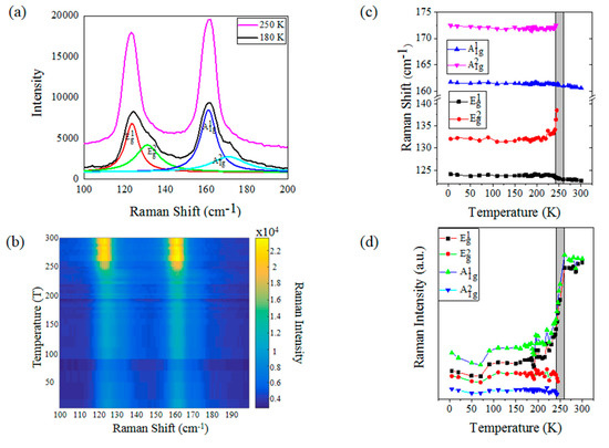 Figure 4b shows the 2D Raman image of as-grown IrTe2 film on h-BN in the temperature range of 4~300 K. The fitted peak position and intensity of Eg and A1g modes are shown in Figure 4c,d. At low temperatures, the crystal structure of IrTe2 is monoclinic, and Eg splits to two peaks: (~124 cm−1), (~132 cm−1) and splits to (~161 cm−1), (~172 cm−1) (Figure 4a) due to the symmetry breaking. As the temperature increased up to 250 K, both Eg and A1g modes showed a single Lorentzian peak (Figure 4a). Moreover, the splitting of Eg and A1g modes can only be observed when T < ~250 K, so the phase transition temperature should be at about 250 K (Figure S6), which is consistent to that in previous literature [29]. In addition, the Raman peak positions of Eg and A1g shifted to lower frequency at ~123 cm−1 and ~161 cm−1, respectively. In addition, the intensity of A1g and Eg modes increased significantly (Figure 4d). This is because of the strengthening of Te-Te and hence increase of electronic polarizability at high temperatures [28]. We did not observe the Raman feature change in the warming process at about 180 K for the phase transition from q1/8 to q1/5 phase. This phase transition is also not expected in the warming process because of the high pinning energy of the q1/8 phase [10].