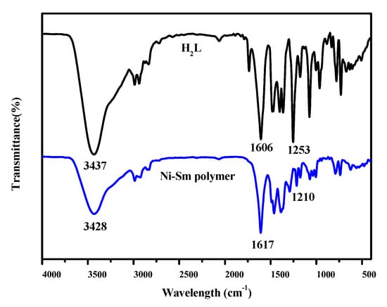 The [Ni(II)-Sm(III)] coordination polymer could be soluble in DMSO and DMF, slightly soluble in ethanol, methanol, THF, dichloromethane, trichloromethane, acetonitrile, and acetone, and insoluble in n-hexane, ethyl ether, and water. Molar conductance of the title polymer in DMF at 25 °C (1 × 10−3 mol·L−1) is 179.6 Ω−1·cm2·mol−1. The result of molar conductivity is inconsistent with the 1:2 electrolyte reported previously [].