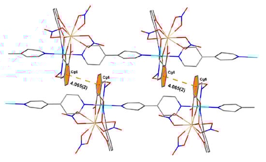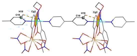 As is depicted in Figure 4, complemented by data in Table 3, in the title polymer structure, five of the couples are weak intramolecular hydrogen bonds (C1–H1B···O10, C9–H9A···N3, C23–H23···O2, C28–H28···O7, and C24–H24···N1) and two intermolecular hydrogen bonds (C4–H4···O9 and C9–H9B···O13), which indicate that the supramolecular interactions exist in the title polymer [,,,,,]. The donor (C1–H1B) from the 3-methoxy substituent group from the (L)2− moiety forms a hydrogen bond with an O atom (O10) of one bidentate chelating nitrate as a hydrogen bonding receptor. The donors (C23–H23, C24–H24, and C28–H28) of the 4,4′-bipy moieties form intermolecular hydrogen bond interactions with O and N atoms (O2, N1 and O7) of the fully deprotonated (L)2− moieties as hydrogen bond receptors. The donor (C9–H9A) of the (L)2− unit is contained in the hydrogen bond interaction with the N atom (N3) of the 4,4′-bipy ligand as a hydrogen bonding receptor. These ligands are connected by C−H···π (C19–H19···Cg2) interactions (Figure 5), forming a one-dimensional chain structure (Figure 6).