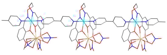 Symmetrical 3-alkoxy salamo-based ligands give relatively easy access to 3d–4f complexes, because the N2O2 cavity in the ligand can coordinate with transition metal ions, while the outer coordination site of the O4 cavity can accommodate rare-earth elements. Interestingly, anionic and solvent molecules are also coordinated with metal atoms. Transition metal atoms usually form distorted octahedral or triangular biconical configurations, while rare-earth atoms usually form a twisted tricapped trigonal prism with nine-coordination or form a twisted bicapped square antiprismatic coordination arrangement with ten-coordination [].
