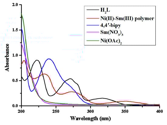The UV/Vis absorption spectra of H2L, its Ni(II)-Sm(III) coordination polymer, Ni(OAc)2·4H2O, Sm(NO3)3·6H2O, and 4,4′-bipy.