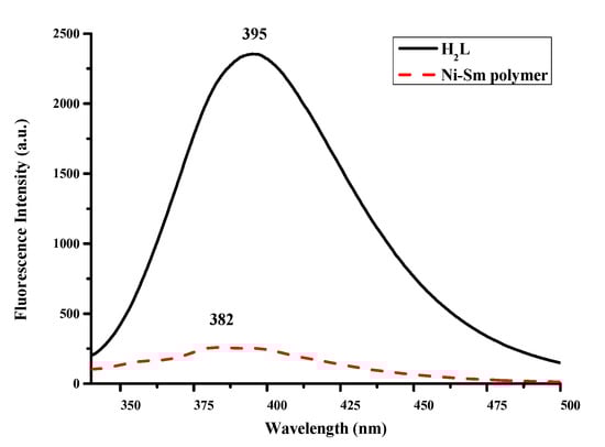 The fluorescence spectra of H2L and the [Ni(II)–Sm(III)] polymer in EtOH (1.0 × 10−5 m) are shown in Figure 11. The results show that H2L presents an intensive photoluminescence with maximum emission at approximately 395 nm at 311 nm excitation, which can be explained as the π–π* transition in H2L. In the title polymer, the emission peak appears at approximately 382 nm, and there is a slight blue shift compared to H2L [], the fluorescence intensity of the title polymer appears to be quenched, and at the same time, it can be seen from the data of the mass spectrum that the polymer solution is almost in the form of [Ni(L)] + 4,4′-bipy + [Sm(NO3)(DMF)3], indicating that the coordinated Ni(II) ion has a heavy atom effect []. The high nuclear charge of the Ni(II) causes the electronic energy levels of the phosphorescent molecules to be staggered, which enhances the spin–orbit coupling of the phosphorescent molecules, thereby increasing the probability of inter-system hopping (ISC) of S1→Tl, thereby quenching the fluorescence. In the fluorescence spectra, only the band at approximately 375–650 nm instead of the f–f emission is expected for Sm(III) ions.