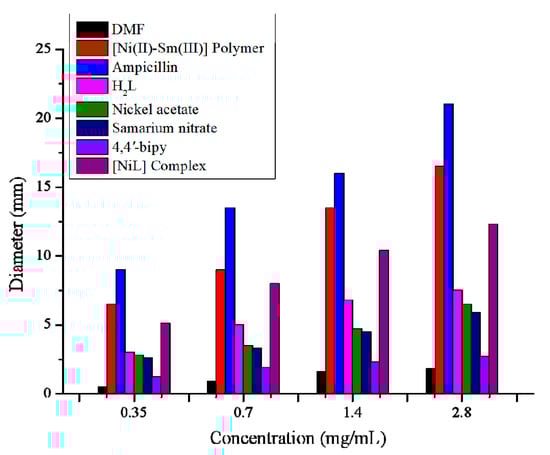 Then, 70 µL of samples with different concentrations were added to the samples with a pipette gun. After an eight-hour incubation period at 37 °C, diameters of the inhibition zones were measured. The experimental results are compared to Ampicillin as a reference standard with various concentrations. The diameters of the inhibition zones of H2L, nickel acetate, and the title polymer are shown in Figure 12. The title polymer shows a more enhanced antibacterial effect than H2L and the metal salt solution under the same conditions. At the same time, the complex [NiL] also has a certain antibacterial activity, but it is not as high as that of the coordination polymer, which may be due to the antibacterial activity of the dissolved polymer being the sum of the comprehensive activities of various components. It can be conjectured from the experimental results and previous literature [], first of all, that this is the result of the destruction of the protein structure in bacteria due to the action of heavy metal ions in coordination polymers []. Secondly, the ligand H2L destroys part of the cell membrane, making the bacteria unable to further divide and reproduce, leading to death. These results are similar to biological activities of related Schiff base complexes previously reported [].