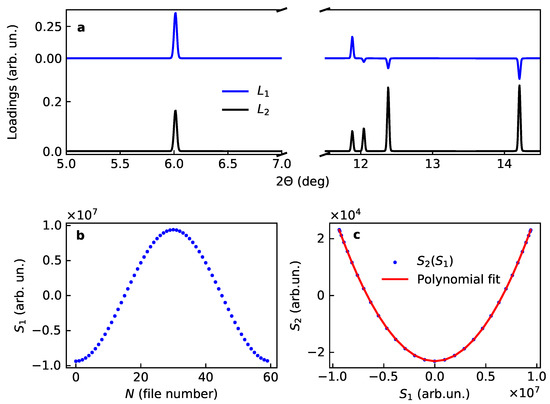 Loadings and scores for two main components for the model case of variation of the occupancy in LiCoO: (a) loadings and , (b) first score and (c) correlation plot for the scores, together with the polinomial fit.