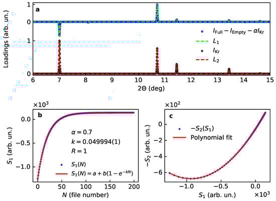 When the line positions, , are not changing and the occupancy of the active sublattice, , is the only variable, the previous simulation has shown that the first score corresponds to the time evolution of the occupancy, the second score gives the square of this evolution, and the second loading can be treated as a powder diffractogram for the active sublattice only [15,18]. In our notation it implies (see Table 1)