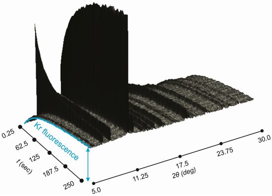 Powder diffraction data collected as a function of time during Kr uptake by –Mg(BH) at 170 K. Note Kr fluorescence background that gives additional measure of Kr in the irradiated volume.