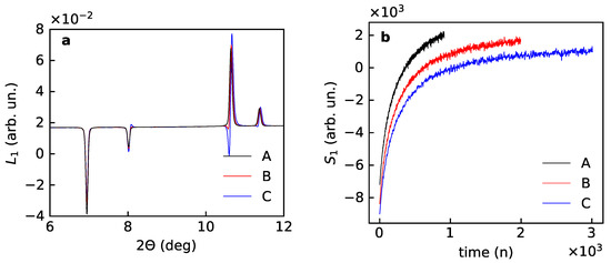 The PCA output for data subsets B and C correlates well with the results for the subset A after the rotational correction (Appendix B). After shifting with a constant all the first scores overlap and match the time dependence of the Kr fluorescence background (Figure 8). All first loadings are also looking similar, close inspection evidence a systematic shift in line positions and distortion of the shape. The shift reflects a change in the average unit cell dimension with time. The change in line shape indicates that for datasets covering longer experimental time higher order terms from Table 1 become significant. A similar effect is reflected in the second loadings, where one sees that the first term in Equation (18) goes down and the second term increases for datasets with longer time. This change in ratio of different diffraction contributions into the PCA components indicates a certain difference in time evolution for Kr occupancy and unit cell dimension: the unit cell size keeps changing when Kr occupancy is nearly saturated.