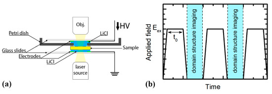 (a) The scheme of the experimental setup. (b) The scheme of the applied field pulse series with domain structure imaging intervals.