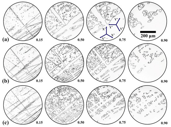 The appearance of the large number of isolated domains and their growth were observed over the whole switched area (Figure 3). The domain shape changed with the field from a regular triangle (Figure 4a,c) to a rounded triangle and, finally, to a circle (Figure 4b,c). The walls of regular triangles (designated as “slow Y− walls”) are strictly oriented along Y crystallographic directions and move in X− directions. The similar transformation of the domain shape in high field from a polygonal one to a circular one has been obtained in uniaxial ferroelectrics with trigonal symmetry: Lead germanate Pb5Ge3O11 [28] and congruent lithium tantalate [29].
