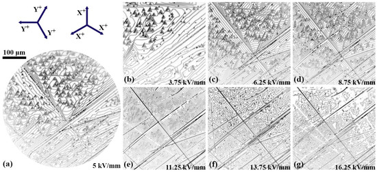 The final stage of the domain structure evolution represents a shrinkage of the last domains with initial orientation of the spontaneous polarization. In low field, the polygonal domains with Y+ and Y− plane walls were formed (Figure 9a) and the anisotropy of wall motion velocity led to significant shape transformations (Figure 9a). Moreover, triangular domains with slow Y− walls rotated by 180 degrees with respect to the initial growing isolated domains were observed (Figure 9b).