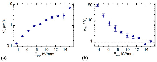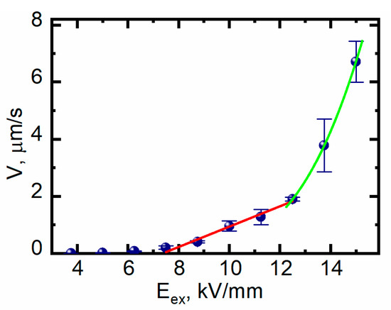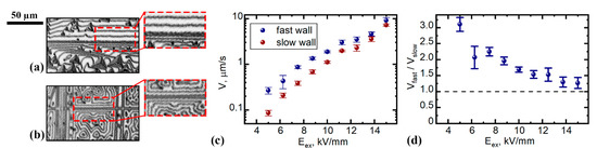 The fitting of experimentally measured wall motion velocities in the whole field range allowed revealing two field regions. In low field regions (Eex < 12 kV/mm), the experimental data were fitted by Equation (1) (Figure 10) with µ = (0.35 ± 0.04)·10−3 mm2/(kV·s) and Eth = (7.4 ± 1.2) kV/mm. In high field regions (Eex > 12 kV/mm), the data were fitted by Equation (2) (Figure 10) with Vmax = (3.7 ± 0.1) mm/s and Eac = (94 ± 1) kV/mm. The Eb parameter was fixed to 0 kV/mm during fitting.