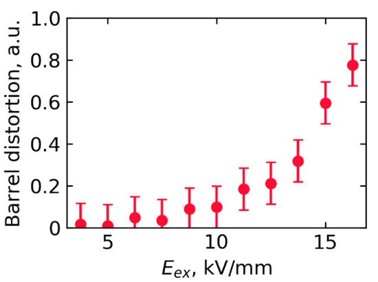The change of the domain shape with the field (“barrel distortion”) was characterized quantitatively (see Appendix B) (Figure 11). The obtained increase in the distortion can be attributed to an increase in the relative input of stochastic nucleation [29].