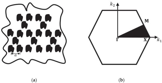 where , , is the filling fraction, and are the components of , is the radius of the scatterers, and are the components of the vector , which defines the position of one of the three scatterers in the unit cell of Kagomé lattice. The Equations (1)–(3) are obtained in [8]. We highlight that Wang et al. [11] regarded the reciprocal lattice vector and the structure function for circular scatterers in a square lattice, reporting incorrect dispersion diagrams of MPnCs with Kagomé lattice.