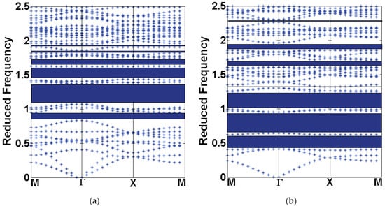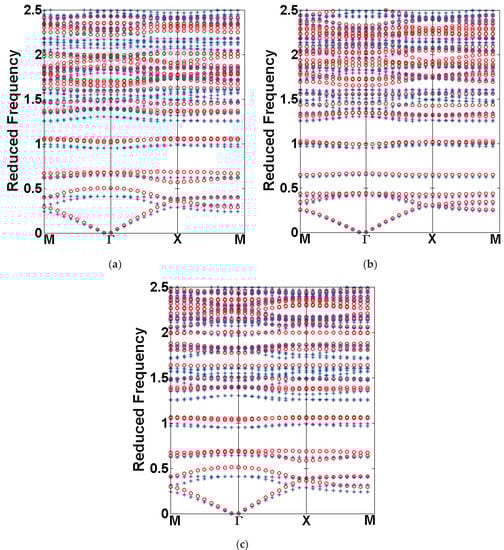 We plotted the dispersion diagrams in the principal symmetry directions of FIBZ (see Figure 1b). Plots are given in terms of the reduced frequency versus the reduced Bloch wave vector, , where is the Bloch wave vector.